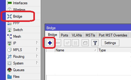 وارد Winbox شوید و به روتر خود متصل شوید. برای افزودن رابط پل جدید در قسمت منو روی گزینه Bridge کلیک کنید. سپس بر روی علامت (+) کلیک کنید.