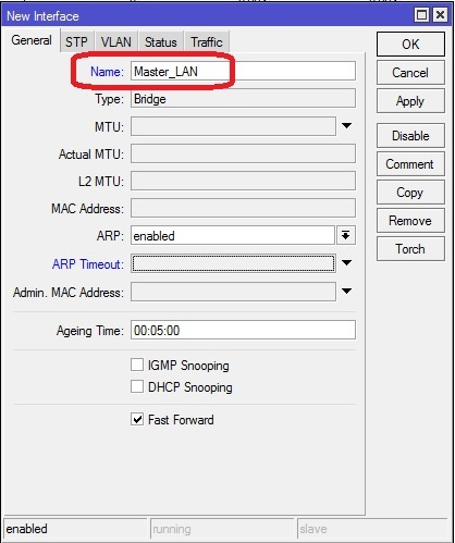 در پنجره New Interface، یک نام توصیفی برای رابط پل (Bridge) در بخش Name وارد کنید. در این مثال، نام را Master_LN قرار میدهیم. سایر گزینهها را بدون تغییر و در حالت پیشفرض رها کنید و در پایان روی Apply و سپس OK کلیک نمایید.