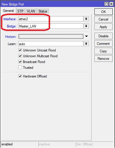 در پنجره New Bridge Port، ابتدا رابط فیزیکی موردنظر (مثلاً Ether2) را از بخش Interface انتخاب کنید. سپس در قسمت Bridge، رابط پل ساختهشده (Master_LAN) را تعیین کرده و در پایان روی Apply و OK کلیک کنید.