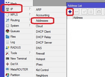 برای انجام تنظیمات، در Winbox به مسیر IP > Addresses بروید و با کلیک روی علامت (+) یک آدرس جدید اضافه کنید.