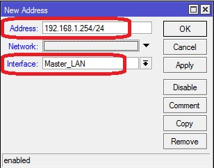 در پنجره New Address، آدرس 192.168.1.254/24 را در بخش Address وارد کنید. نوشتن /24 بهعنوان CIDR باعث میشود نیازی به تعریف جداگانه ماسک شبکه نباشد. سپس در قسمت Interface، پل ساختهشده (Master_LAN) را انتخاب کرده و در پایان روی Apply و OK کلیک کنید تا تنظیمات ذخیره شود.